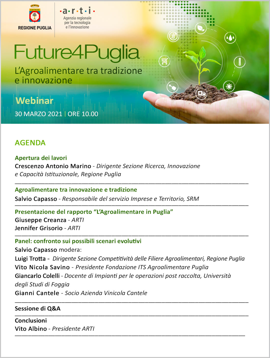 Il 30 marzo 2021 si svolgerà il webinar "Future4Puglia: l'Agroalimentare tra tradizione e innovazione", organizzato dall'ARTI e Regione Puglia per individuare gli scenari futuri dello sviluppo di filiere strategiche per la Regione e coprogettare policy in grado di renderli concreti.